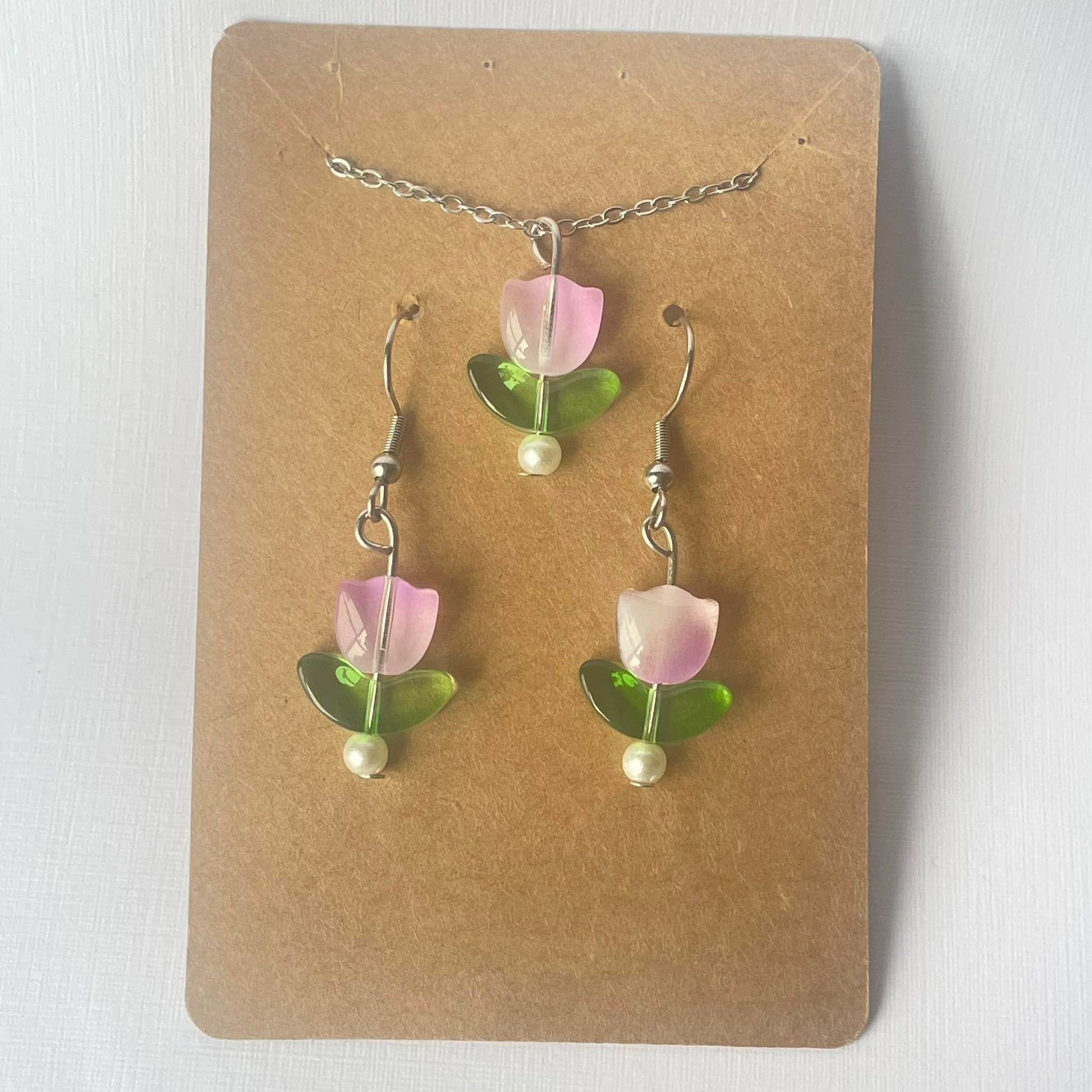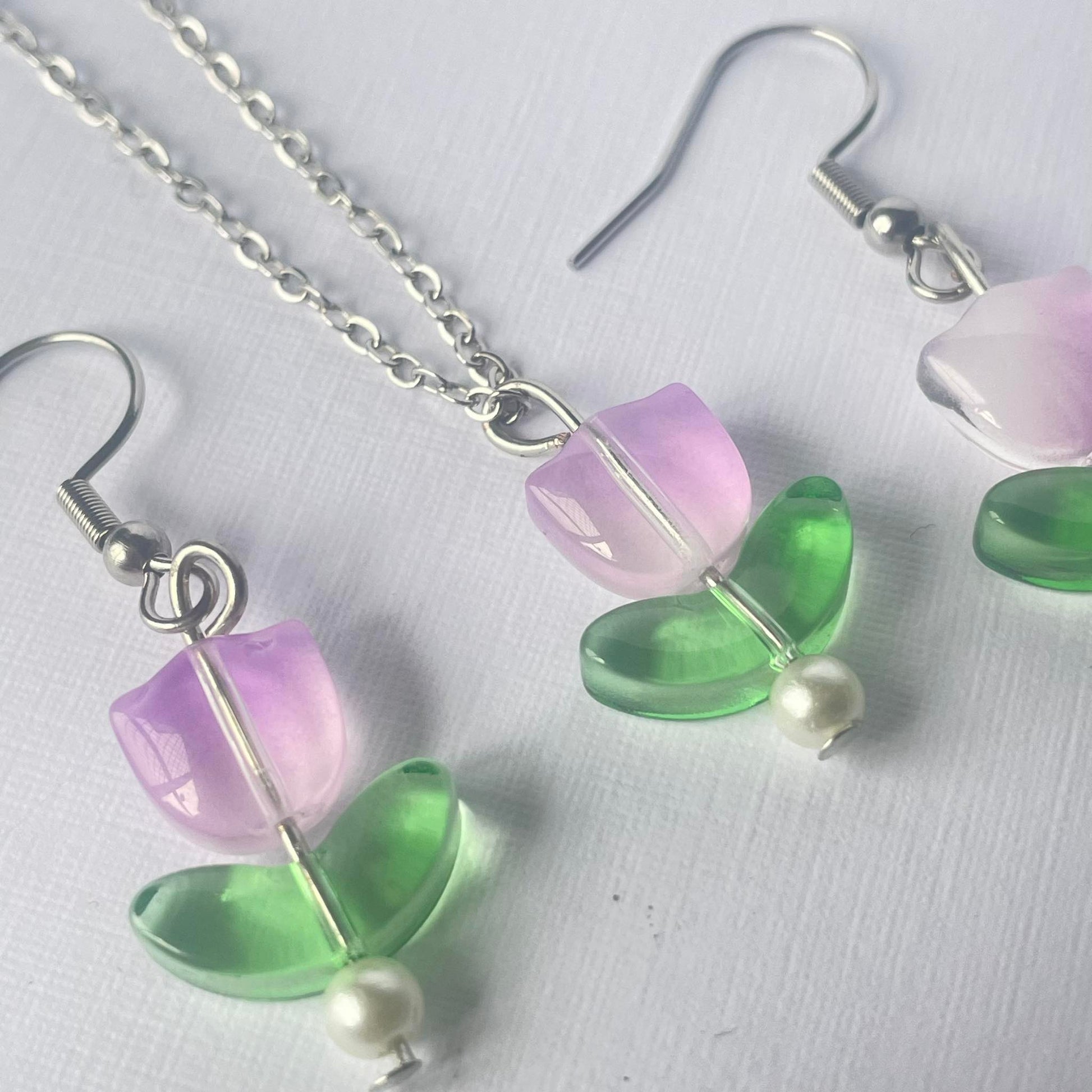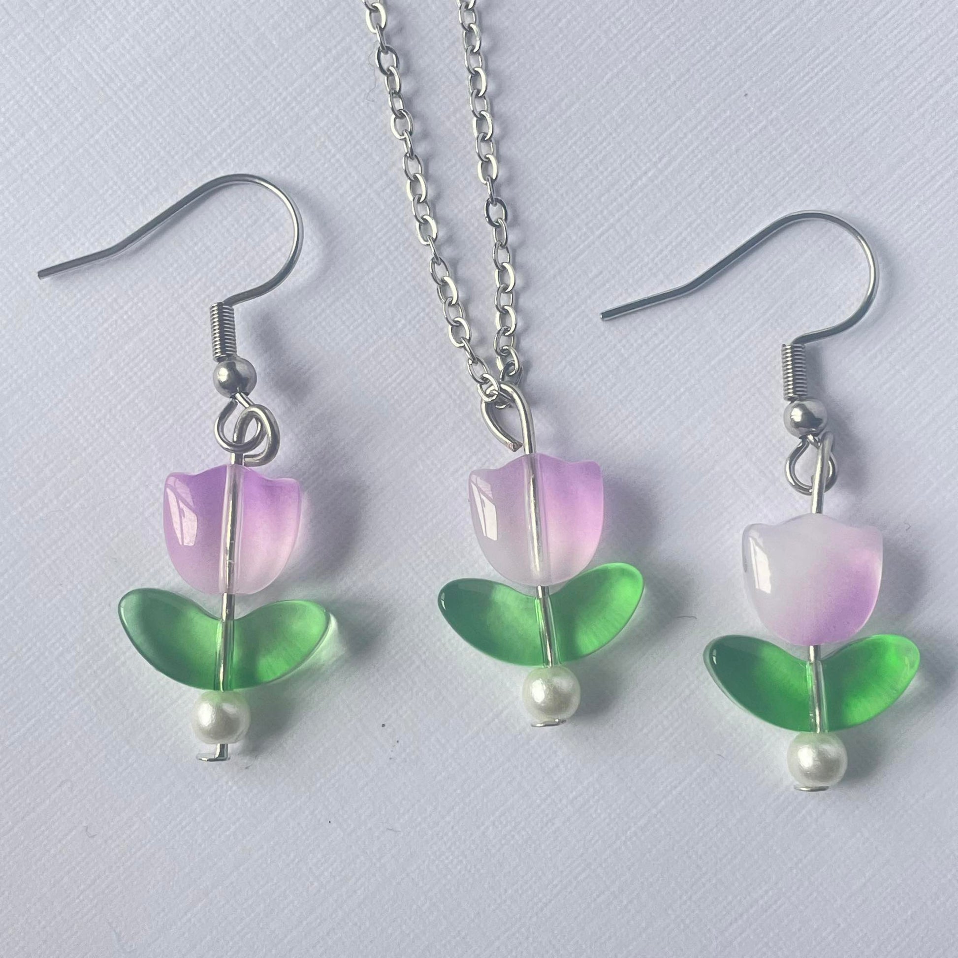 This handmade tulip-inspired jewelry set includes delicately crafted earrings and a matching necklace. The earrings feature tulip blooms on hypoallergenic hooks, while the necklace pendant mirrors the design. Elegant and versatile, this set adds a touch of nature-inspired beauty to any outfit.